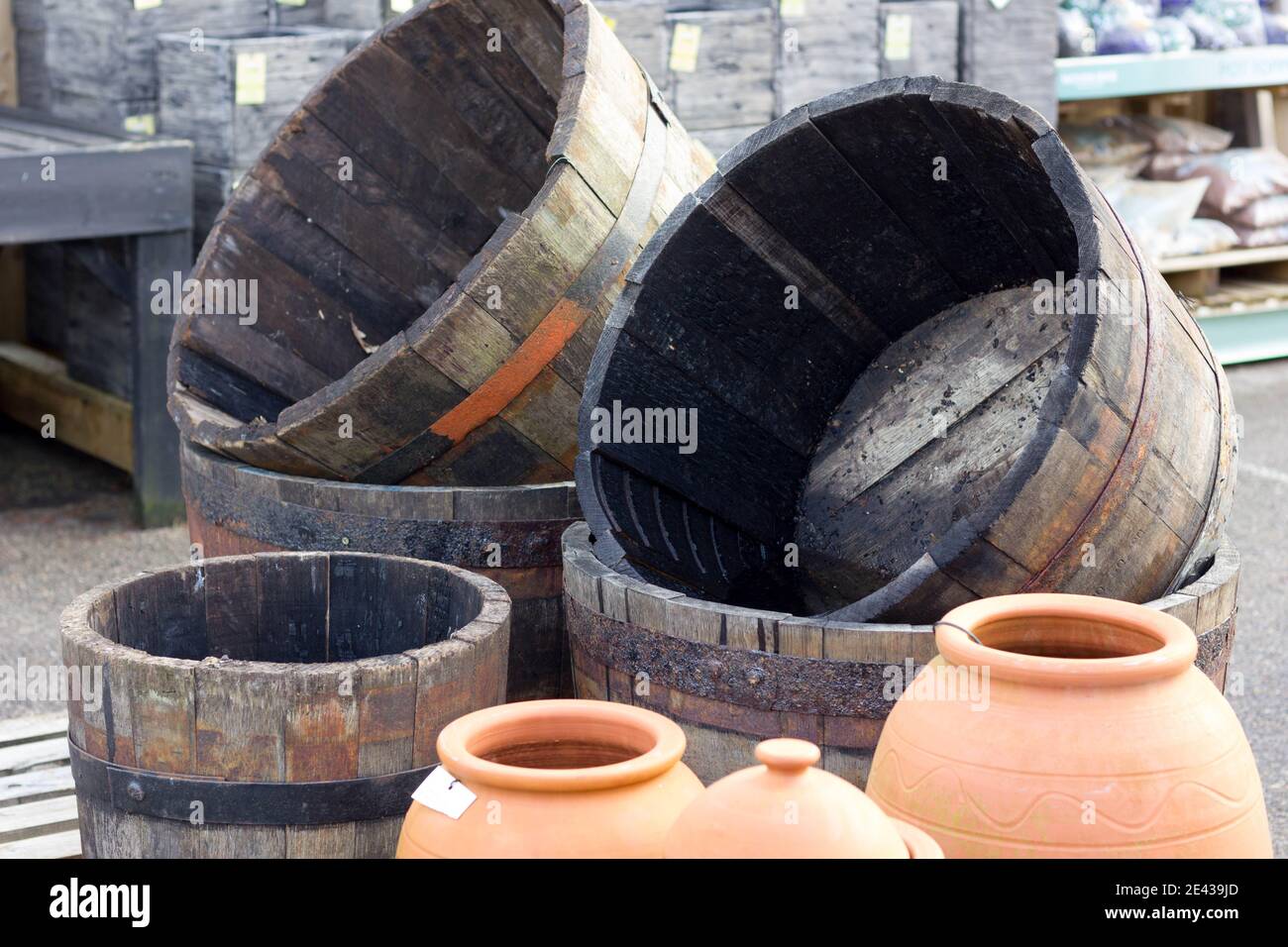 Wooden Barrel Tub Planters Stock Photo Alamy